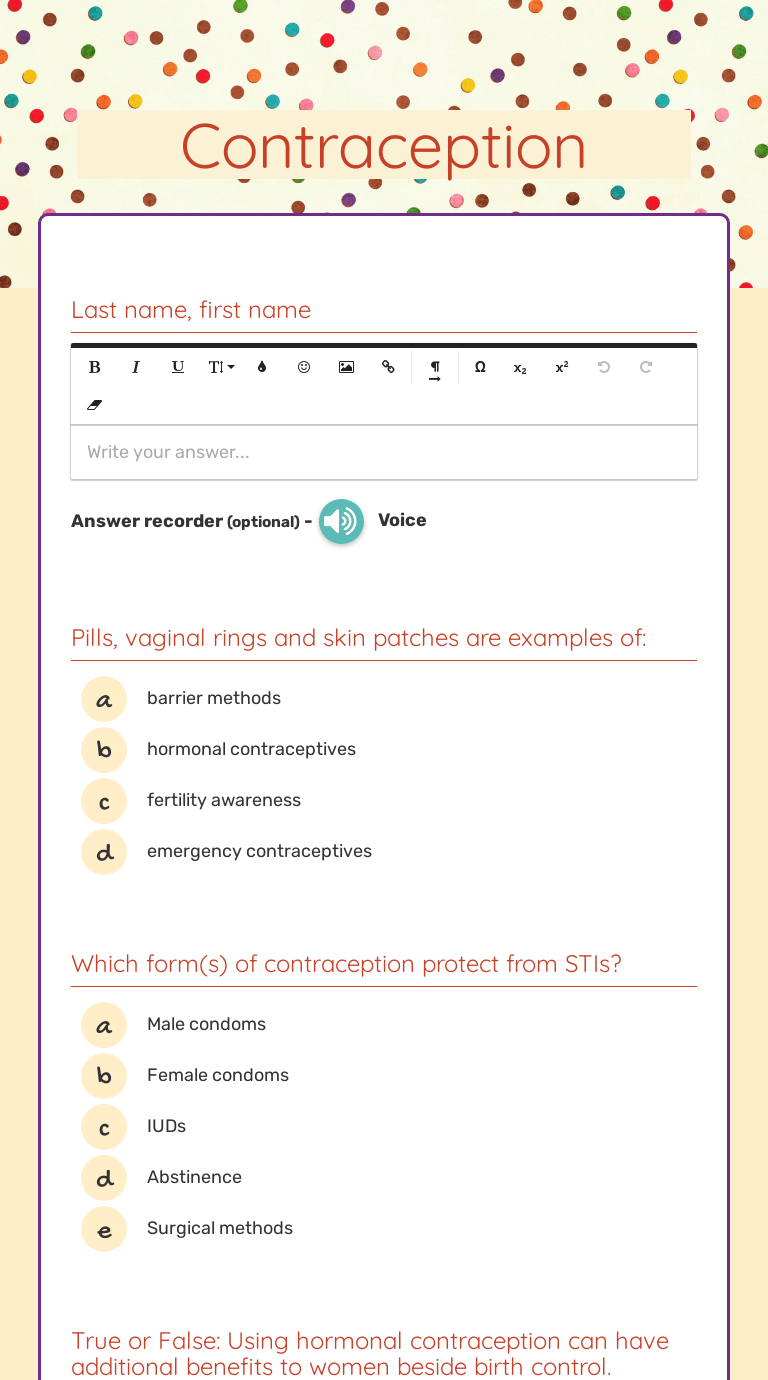 Risk factors for blood clots . Some of the most common ones are: No side effects, as with other methods. The best way to prevent a pregnancy or an std is to not have sex. Side effects of birth control pills; These assessments will test you on the following: Hormones mimicked by oral contraceptives; In this worksheet, we will practice explaining how hormones are used in contraception and evaluating the effectiveness of hormonal and nonhormonal methods . Review information about birth control methods in order to accurately answer students'. Identify available birth control methods, including abstinence: 8th grade contraception methods powerpoint. Check the pregnancy rates on this chart to get an idea of how effective . This activity starts with some advantages and .